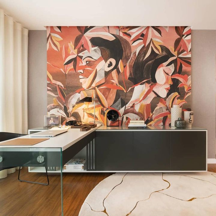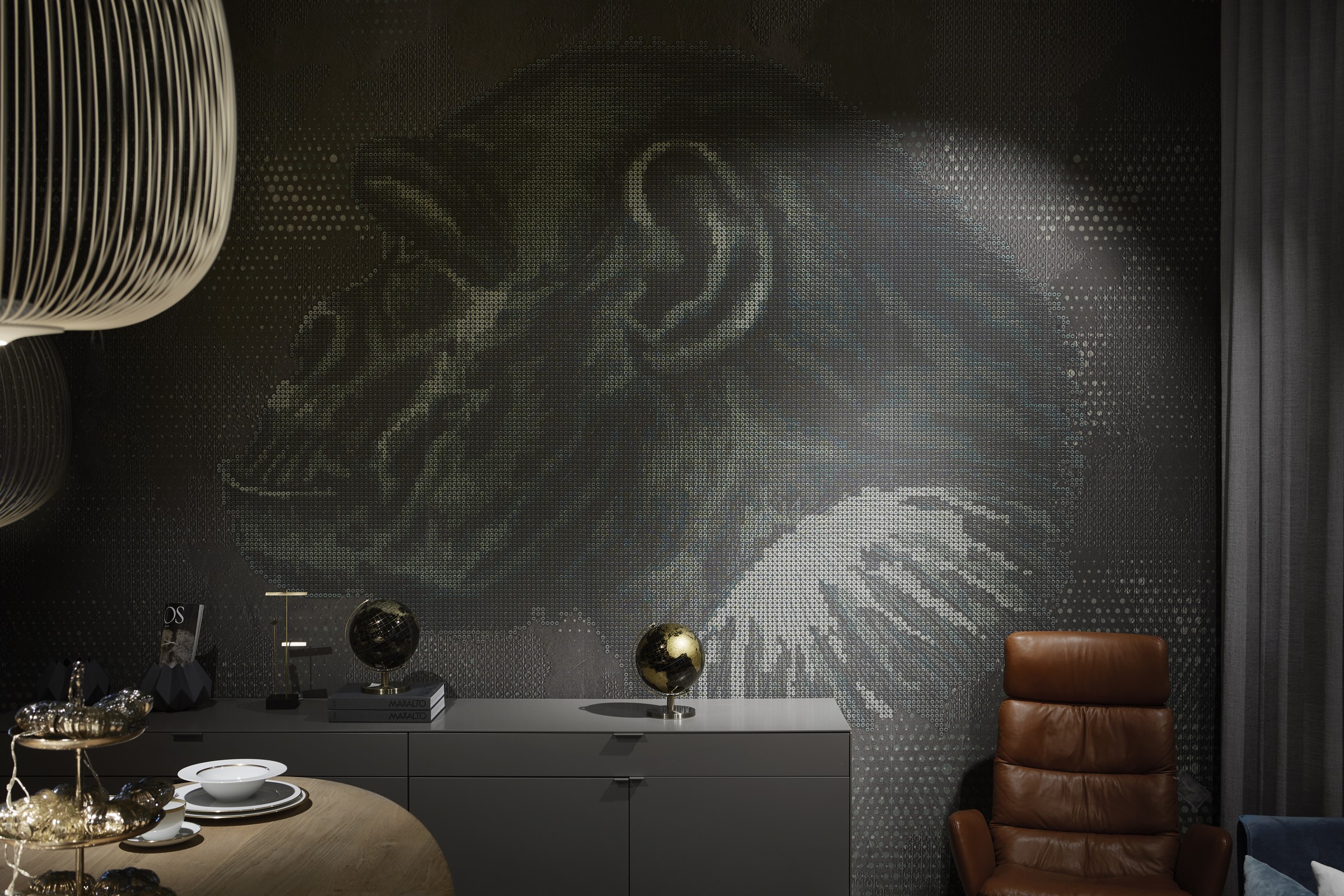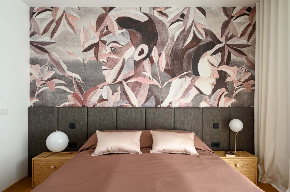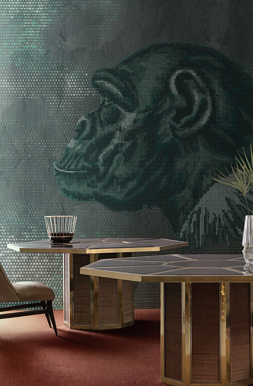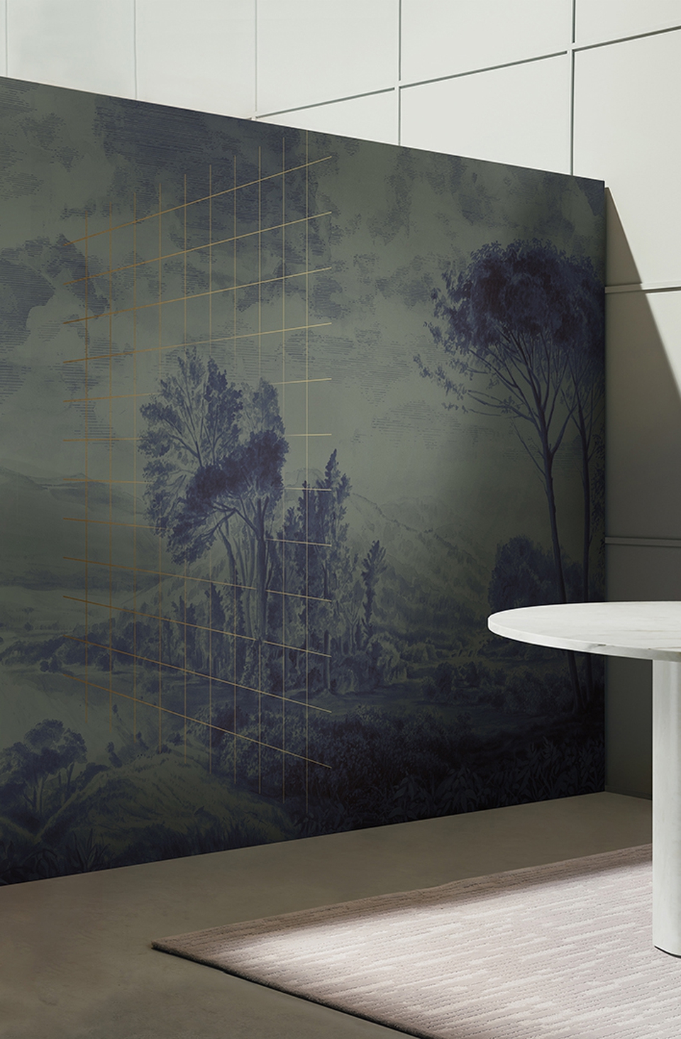 La carta da parati ‘Delove’ di Maria Gomez Garcia rappresenta due grandi volti, uno maschile e uno femminile: posizionati di spalle tra loro, sono in totale fusione con il fondo di foglie e fiori, in un’atmosfera enigmatica e al tempo stesso avvolgente.