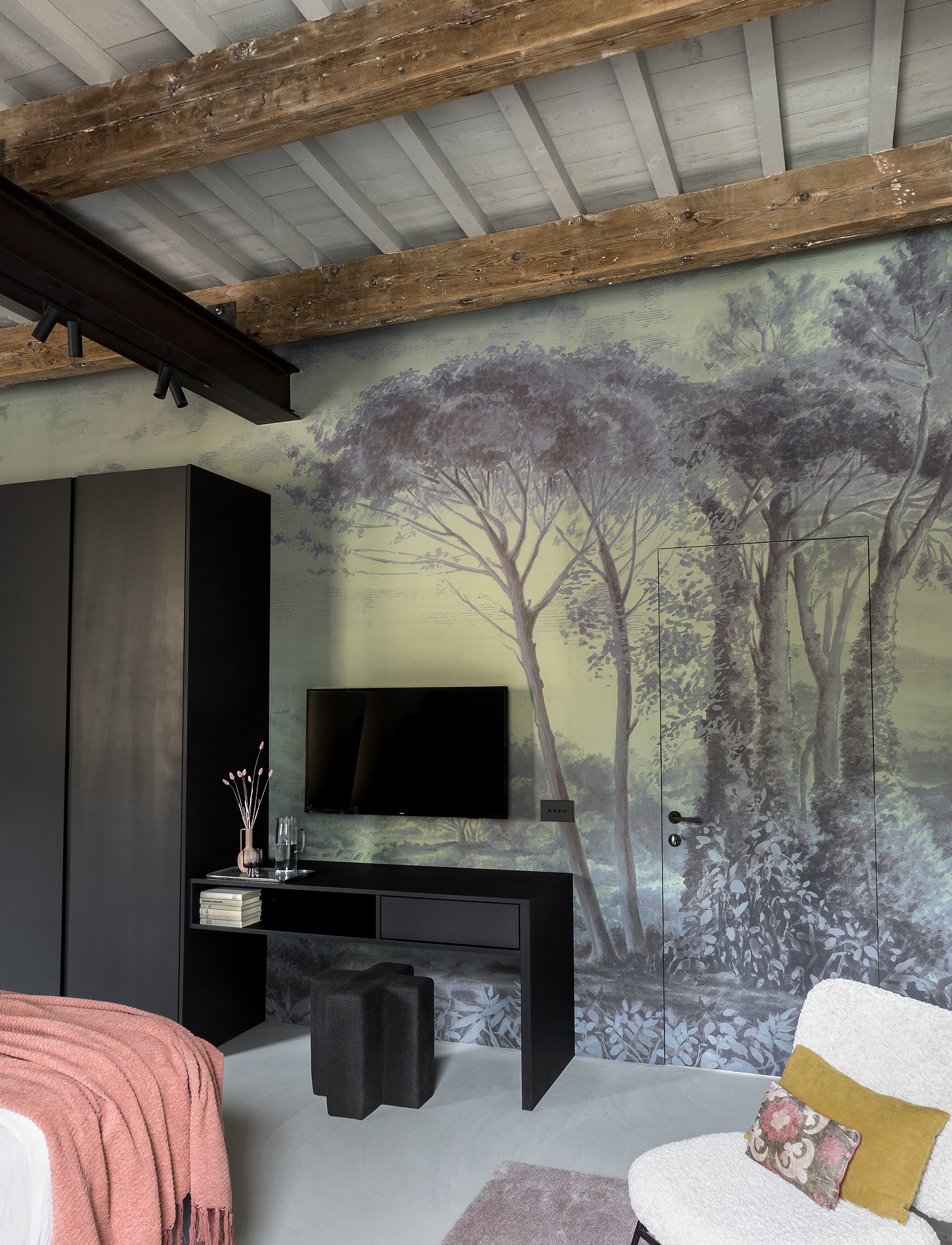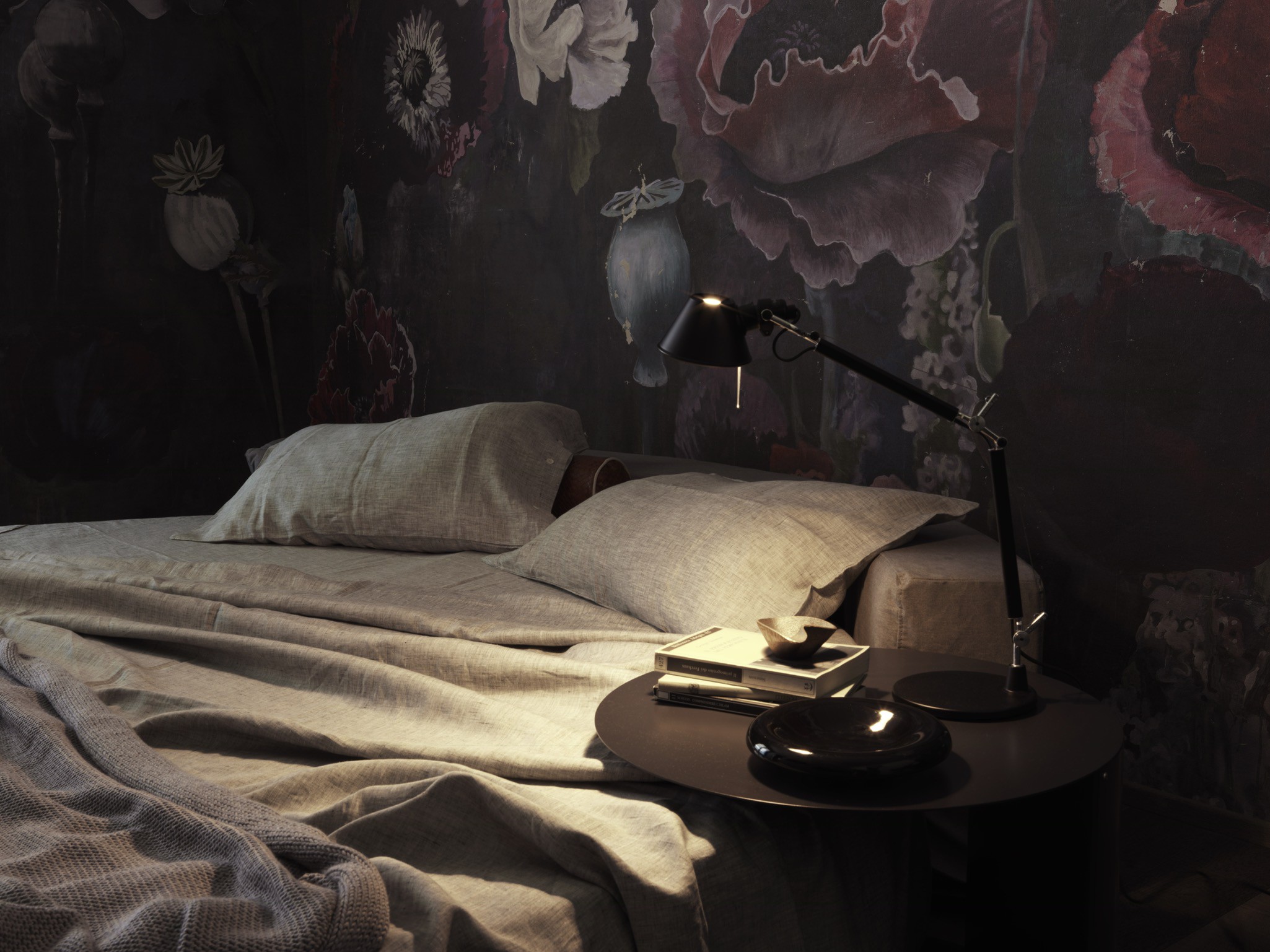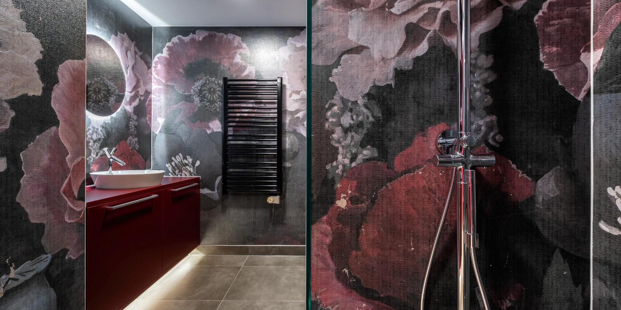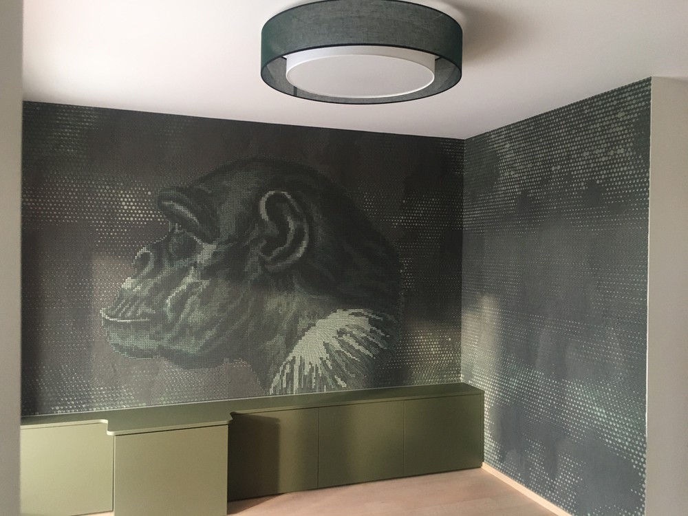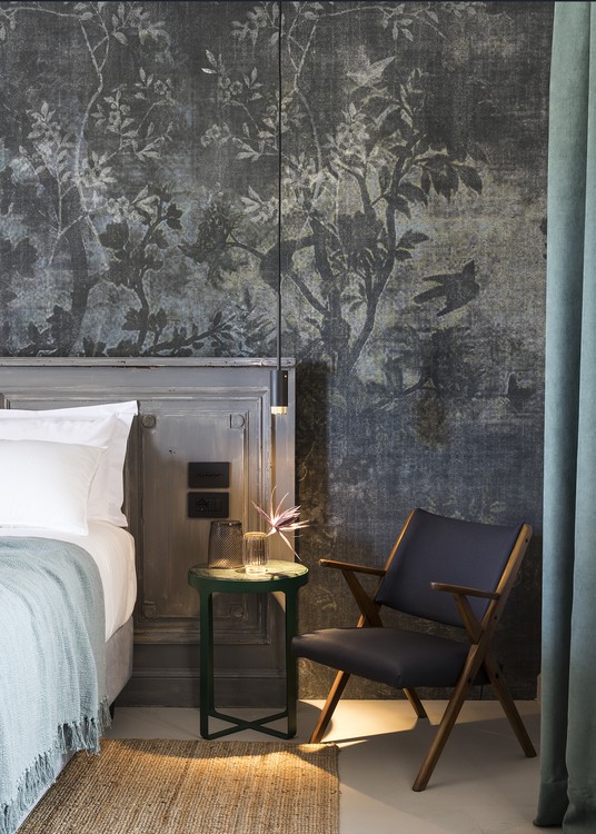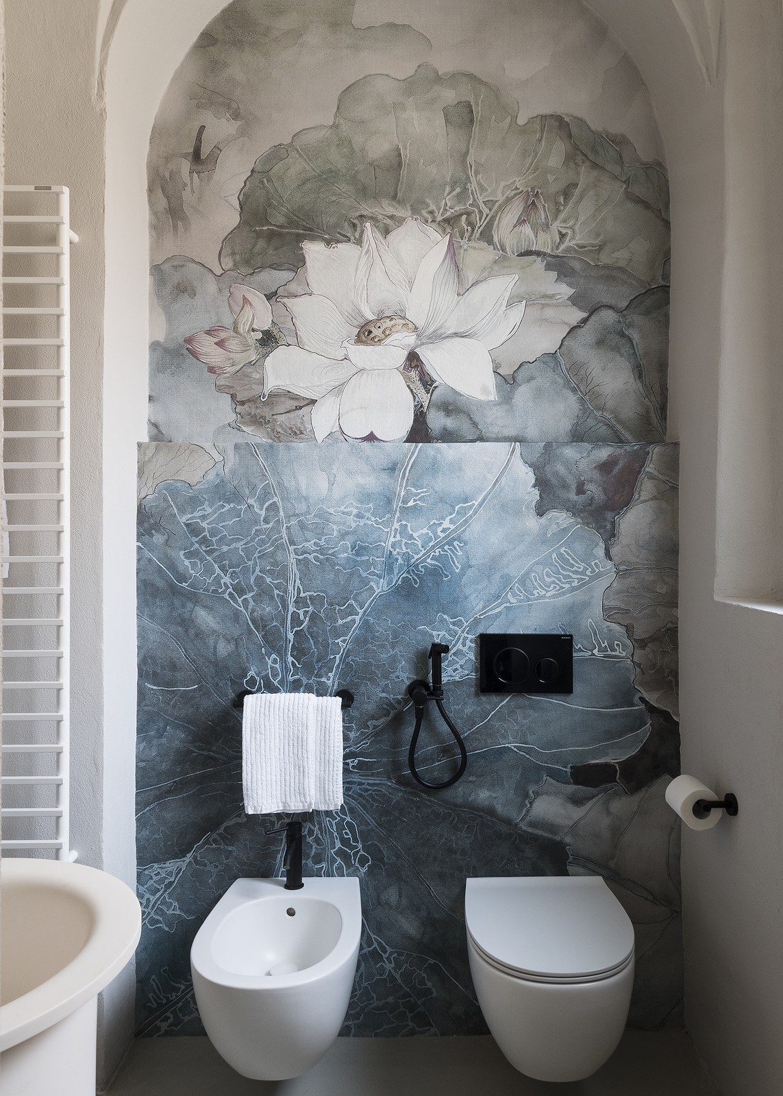 La carta da parati ‘Delove’ di Maria Gomez Garcia rappresenta due grandi volti, uno maschile e uno femminile: posizionati di spalle tra loro, sono in totale fusione con il fondo di foglie e fiori, in un’atmosfera enigmatica e al tempo stesso avvolgente.