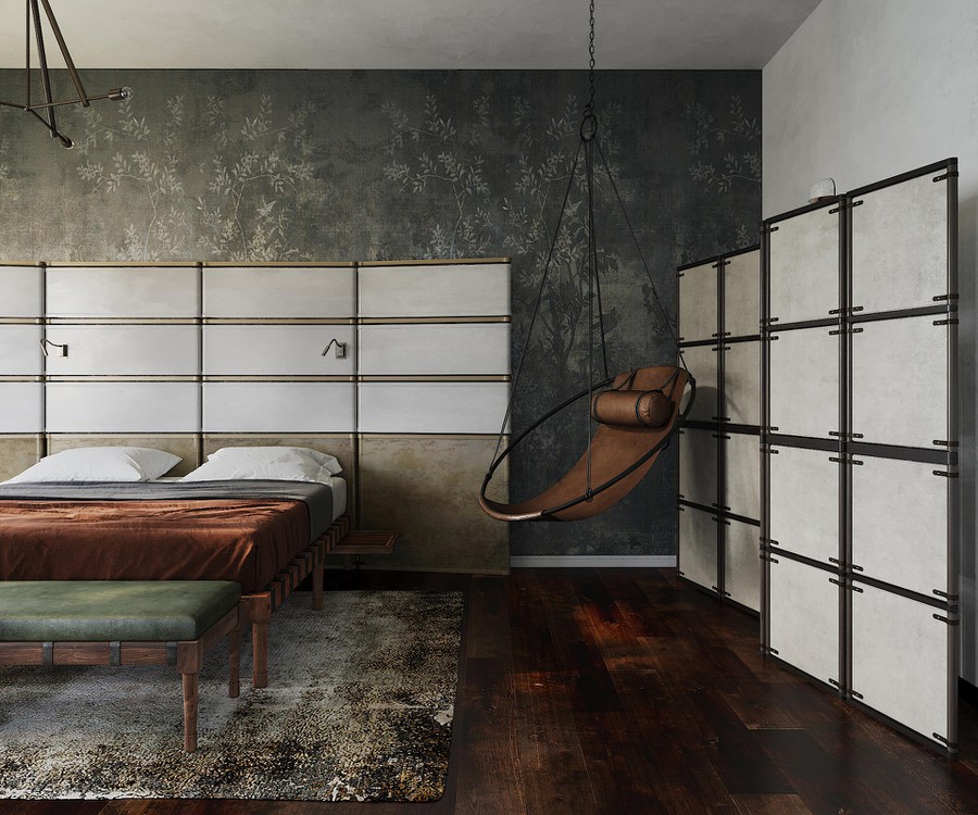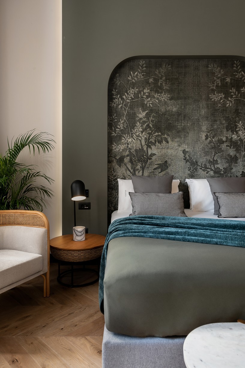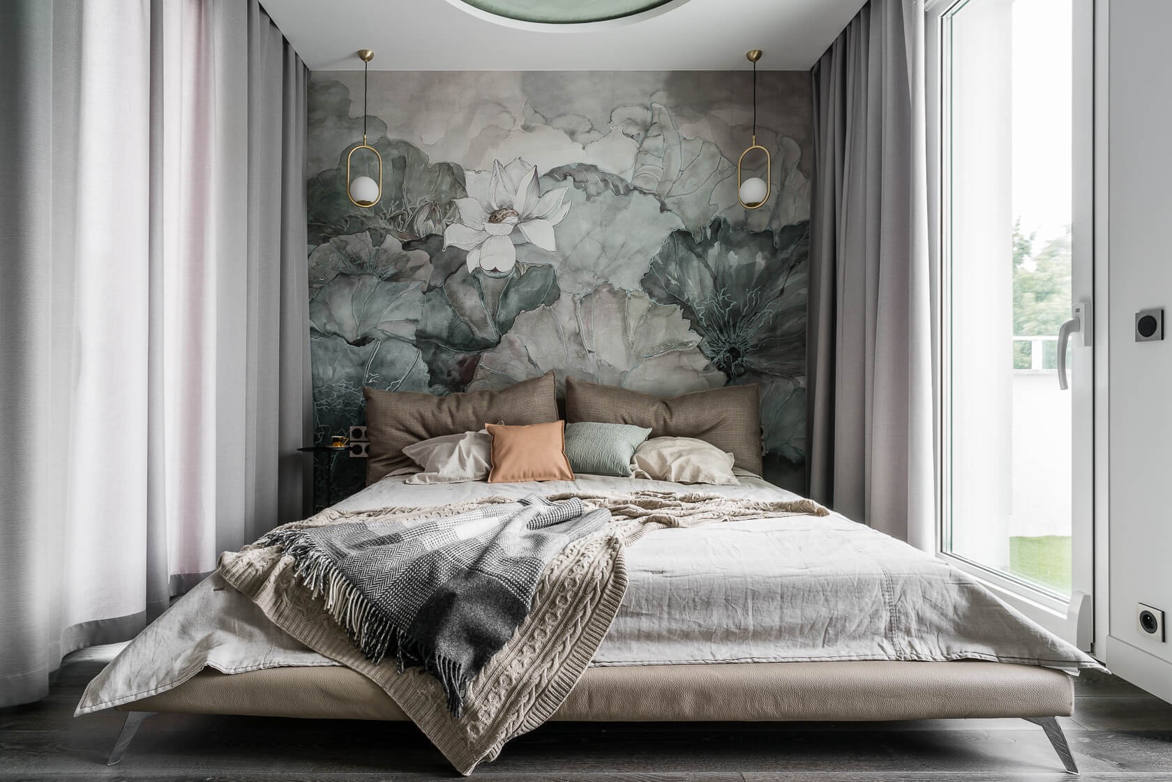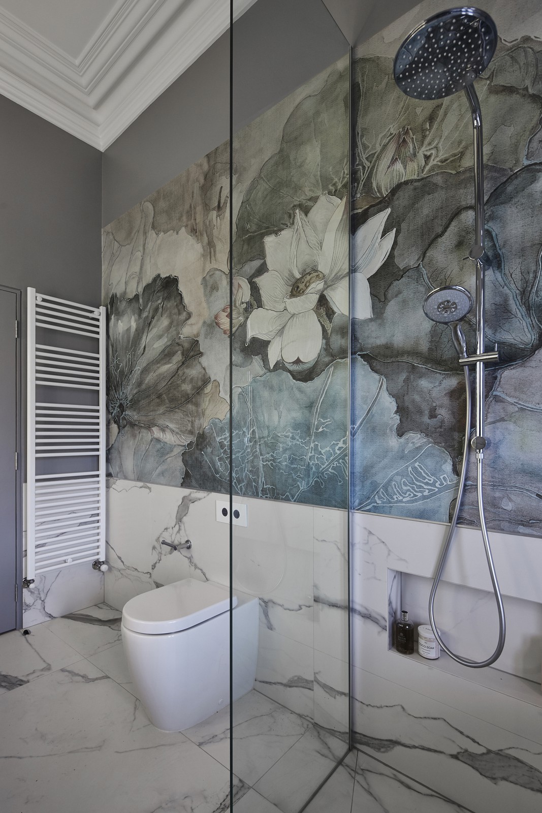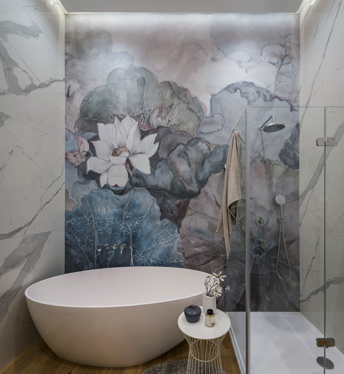 La carta da parati ‘Delove’ di Maria Gomez Garcia rappresenta due grandi volti, uno maschile e uno femminile: posizionati di spalle tra loro, sono in totale fusione con il fondo di foglie e fiori, in un’atmosfera enigmatica e al tempo stesso avvolgente.