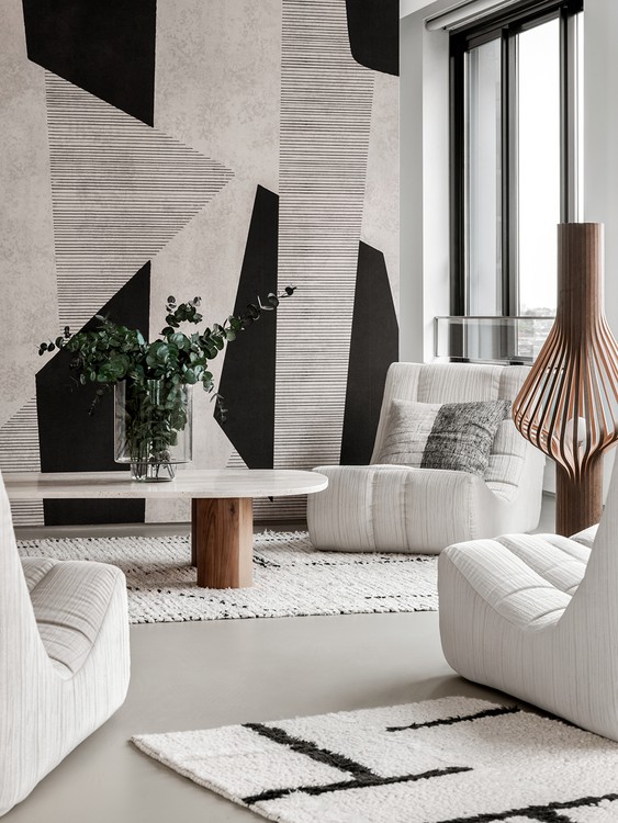 Una grafica che esplora l'equilibrio tra pieni e vuoti, utilizzando una palette di colori in bianco e nero che ne evidenzia l’aspetto minimalista e contemporaneo.